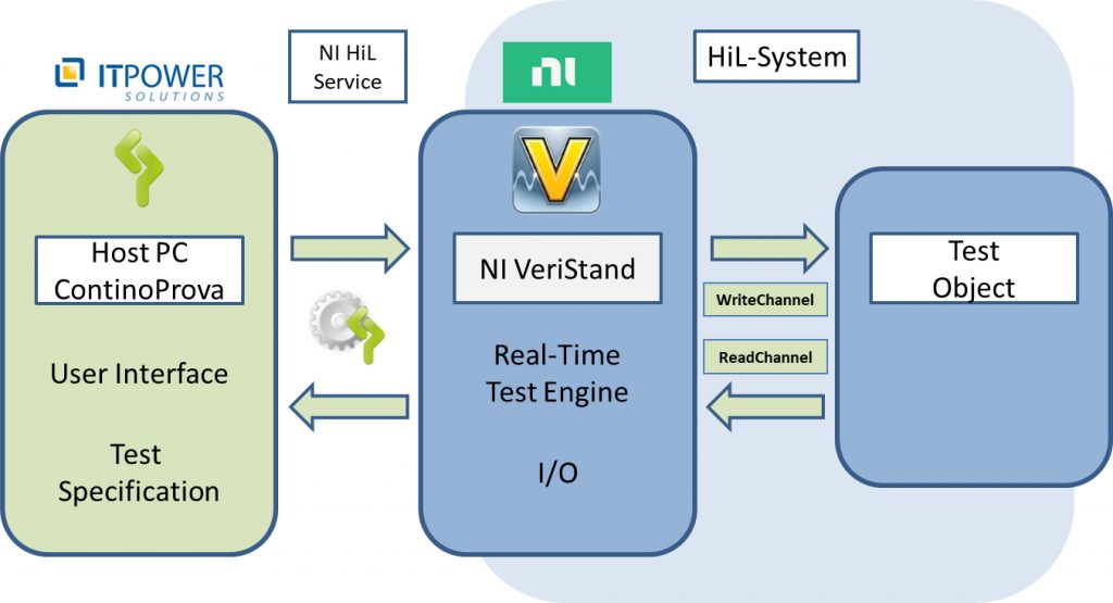 Abbildung 1 zeigt den schematischen Aufbau der NI HiL-Testumgebung mit dem angebundenen Testtool ContinoProva. Das Tool wird auf einem Windows PC ausgeführt. Dadurch können mithilfe des Tools ausführbare Testszenarien am PC spezifiziert und die Daten anschließend an das Echtzeit-System zur weiteren Verarbeitung übergeben werden. Grundlage für die Kommunikation zwischen ContinoProva und VeriStand ist der implementierte Service, hier NI HiL-Service genannt. VeriStand übernimmt als Testengine die Ansteuerung von und die Kommunikation mit der HiL-Umgebung und dem Testobjekt. Die Ausgangssignale und Daten des Testobjekts werden zur Bewertung und weiteren Verwendung über VeriStand an ContinoProva zurückgesendet.