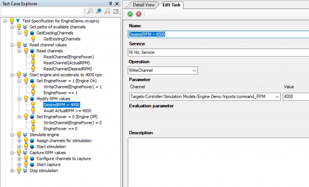 Abbildung 2 zeigt einen für VeriStand mit ContinoProva spezifizierten Test. Dieser besteht, wie in der Baumstruktur auf der linken Bildseite dargestellt, aus mehreren Testgruppen, die wiederum mehrere Testsequenzen enthalten. Eine Testsequenz wird durch eine Folge von Testschritten gebildet, die sequenziell abgearbeitet werden. Testschritte sind die kleinsten Testausführungseinheiten. Die Operationen eines Testschrittes werden Testtasks genannt. Im vorliegenden Fall wird der Test eines Motorsteuergerätes demonstriert. In der Abbildung ist exemplarisch das Fenster zum Testtask „DesiredRPM = 4000“ dargestellt. Die Motordrehzahl soll hier auf den definierten Wert gesetzt werden. In dem Testtask wird dazu die Operation WriteChannel aus dem NI HiL-Service und der Wert 4000 für das Eingangssignal command_RPM aufgerufen. Mit diesem Verfahren können Testfälle für alle Komponenten und Tools in der HiL-Umgebung auf einfache Art erstellt und über die zentrale Benutzeroberfläche verwaltet werden.