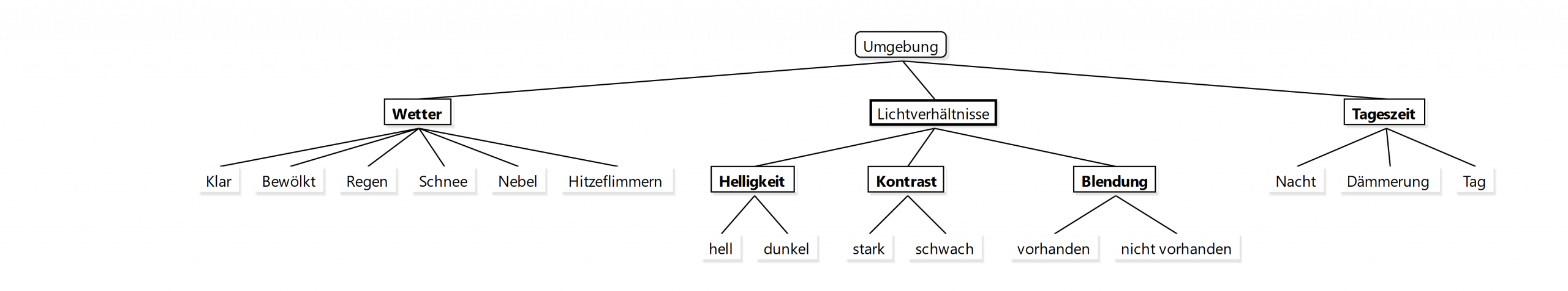 One suitable method is classification tree analysis. The paths of the tree describe environmental variables and sources of error organized into categories (see Figure 1). Useful categories for a system used in road or rail traffic include weather and lighting conditions, motion disturbances, and camera hardware and software errors.Metamorphic image transformations are changes made to images that do not affect the label of the image. For example, if the brightness of an image is reduced, the image changes, but the position and type of objects recognizable in it do not.