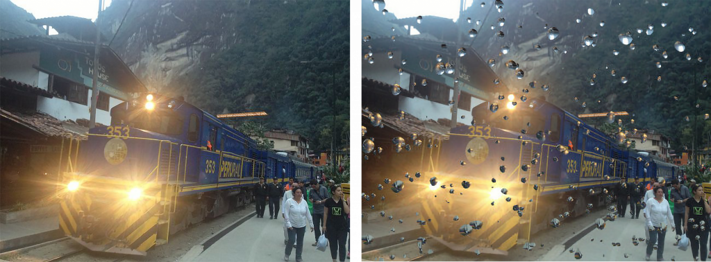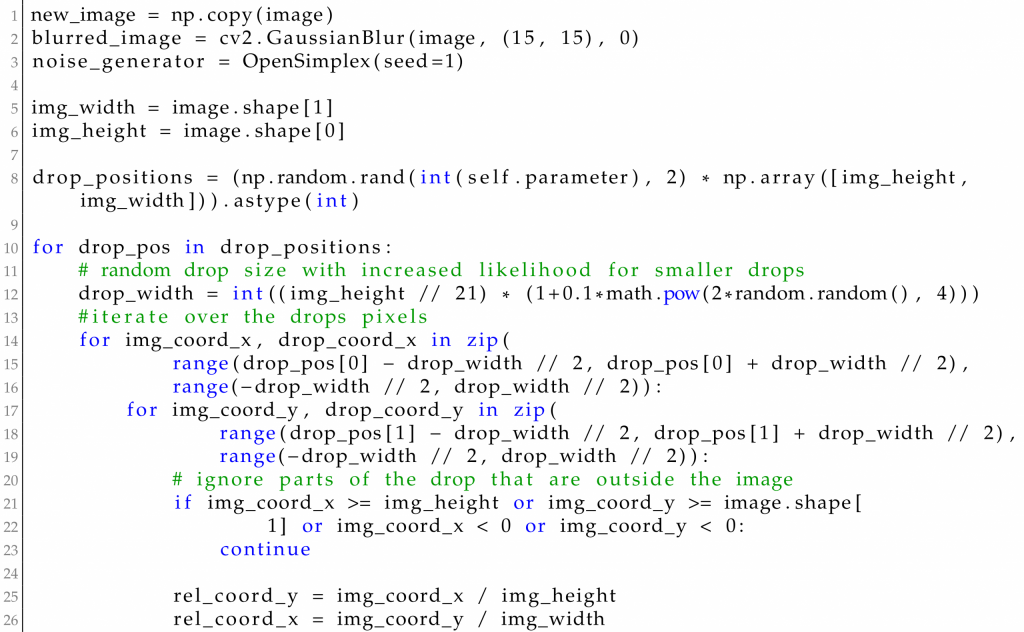 An example of a transformation is an implemented algorithm that simulates raindrops on a window pane (see Figure 3). To simulate the raindrops, refractive circles were randomly placed and deformed in the image. The position and size of the drops were determined randomly, and the number of drops can be set by the user. A probability distribution was used to ensure that smaller drops occur more frequently than large ones. The height of each drop at each position was then determined. This is defined by a cosine function and applied with simplex noise so that the drops have a random shape. The normal vector of the drop at the current position is then determined. Only the X and Y values of this vector are used and subtracted from the current position in the image to create a refraction effect. An excerpt of the source code for this algorithm is shown in Figure 4.