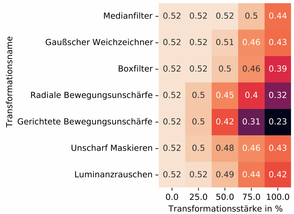 Figure 5 shows an excerpt from the results of the experiment. With unchanged images, the accuracy is highest at 0.52. The accuracy decreases to varying degrees as the transformation strength increases. It is clear to see that the object recognition system is most severely disrupted by directional motion blur effects. The method therefore provides indications of where development work needs to focus. In this case, measures must be taken to prevent or minimize the occurrence of motion blur.