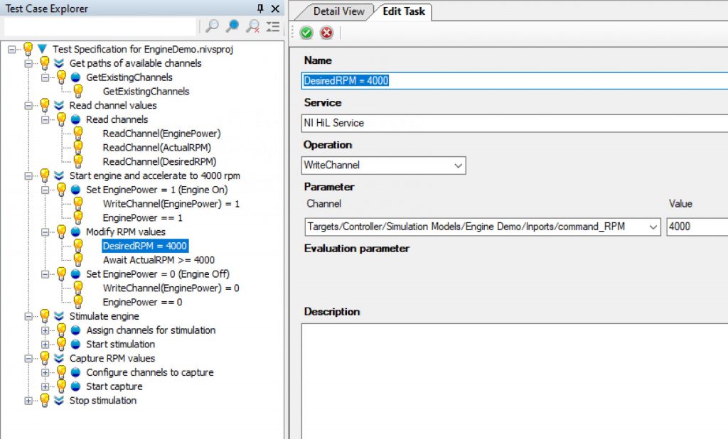 Figure 2 shows a test specified for VeriStand with ContinoProva. As shown in the tree structure on the left side of the image, this test consists of several test groups, which in turn contain several test sequences. A test sequence is formed by a series of test steps that are processed sequentially. Test steps are the smallest test execution units. The operations of a test step are called test tasks. In this case, the test of an engine control unit is demonstrated. The figure shows an example of the window for the test task “DesiredRPM = 4000”. Here, the engine speed is to be set to the defined value. In the test task, the WriteChannel operation from the NI HiL service and the value 4000 for the input signal command_RPM are called. This method allows test cases for all components and tools in the HiL environment to be easily created and managed via the central user interface.