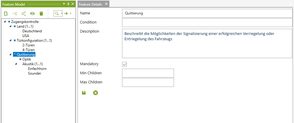 In this way, for example, limits can be defined for the number of features that can be selected from a group. For example, in the feature model shown, only one country or door configuration is allowed per product variant. Feature characteristics are attributes that contain information about a feature, such as names and value ranges.